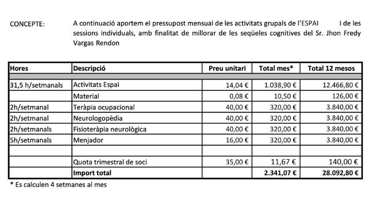 Les dejo abajo el presupuesto de un centro de rehabilitación para 12 meses. Todas las donaciones las vamos a invertir en mejorar la salud mental de Jhon y en un programa de inserción laboral para la primavera o el verano de 2025. De esta manera, Jhon tendrá una rutina y habrá recuperado parte de su autonomía. Aunque va a tener que recibir ayuda, eso sería un gran paso adelante, ya que nadie lo esperaba.